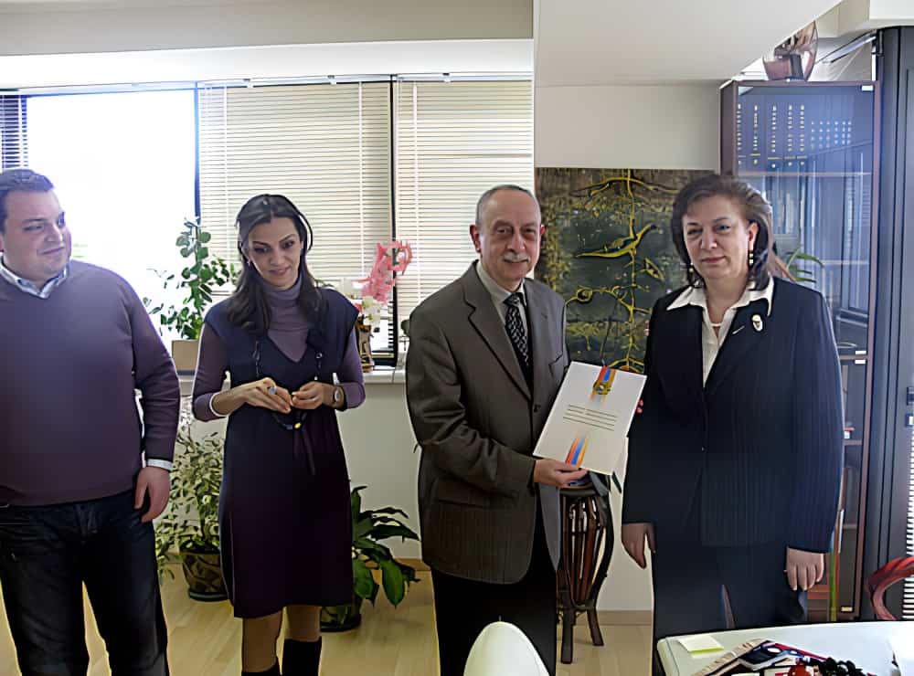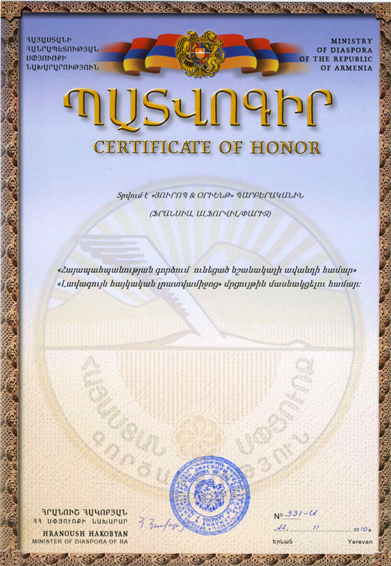 M. Sirapian a offert à Madame le ministre, le dernier numéro de la revue E&O (qui est publiée depuis 2005). M. Sirapian a également présenté la maquette d’un Beau livre « Mon ami Toumanian » à paraître en avril 2011, incluant 24 œuvres de Hovhannès Toumanian, traduites en français par Alice…