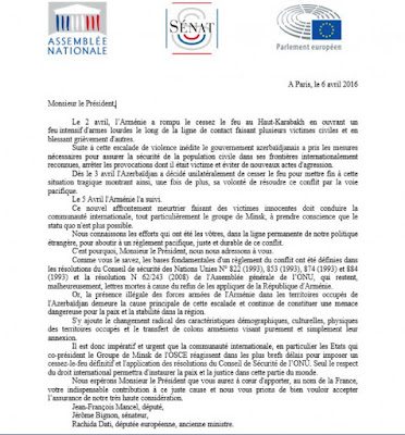 Les limites de cynisme et de mensonge effronté ont été franchies par une lettre adressée au président de la République François Hollande, datée du 6 avril, alors même que les corps des victimes civils, sauvagement mutilés par les bachibouzouks d’Aliev n’ont pas encore été enterrés. Lettre cosignée par J.-F. Mancel, J. Bignon et R. Dati.