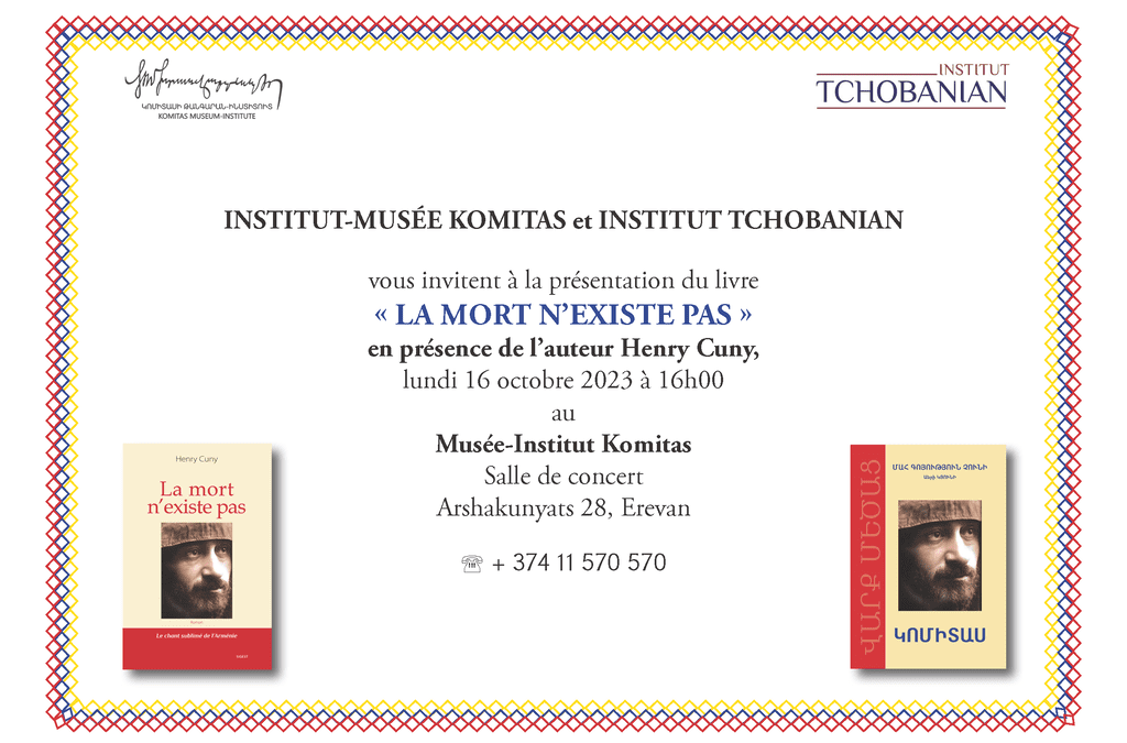 Présentation du livre “La mort n’existe pas” Dans le cadre des « Rencontres francophones d’Erevan » 2023, l’Institut Tchobanian, en partenariat avec le musée-Institut Komitas, organise la présentation du livre d’Henry Cuny, “La mort...